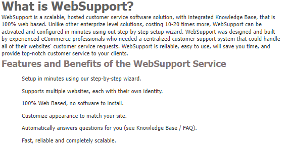 Well, you made it here on a Monday, so we figured we would tell you a little more about why our WebSupport system is a first-rate help desk software solution. First off, WebSupport is 100% web-based, so you don't have to worry about installing software or updating it; we will always take care of that for you. Secondly, WebSupport has been tested on real eCommerce and informational websites since 1999. The system works and it works well. Thirdly, it is feature packed. WebSupport PRO comes with support for multiple email addresses (so you can send all of your support email addresses directly to our system), an integrated Knowledge Base (create a knowledge base for each website you configure), and a FAQ builder (again you can create a separate FAQ for each site you configure in WebSupport). You will not find a system with this many features anywhere else for this kind of money.