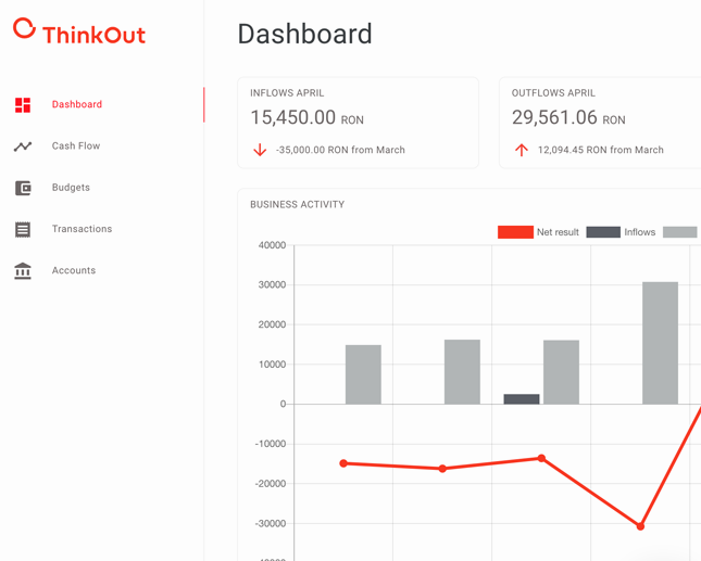 ThinkOut is the online platform that delivers financial analysis and forecasting for SMEs in just a few minutes, based on the transaction history from their bank accounts. On a single screen you can check the total balance for your connected bank accounts, the cash runway given the current balance and the expense rate or the revenue and expenses of the past three months. ThinkOut automatically fills in the cash flow plan with data from the bank account statements. It displays in an accessible, visual manner the way your company’s money is distributed on income and expense categories. ThinkOut translates the transactions data into easy-to-understand charts that shine more light on how the income and expenses are structured and evolve. The platform gradually builds cash flow forecasts based on the business activity over the past years. This way you can plan your business according to anticipated income and expenses patterns.