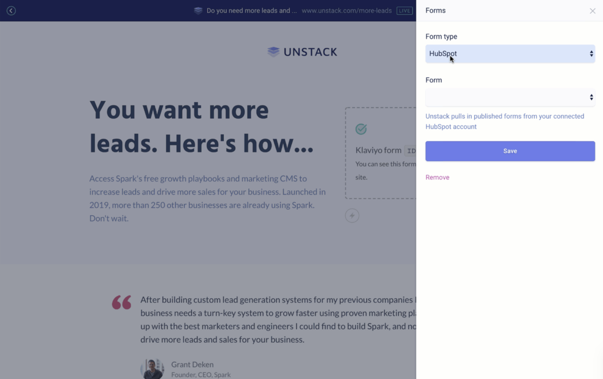 Unstack's content marketing platform is designed to help you rapidly build, measure, and scale digital presence without code, developers, or headaches. Beautiful websites, landing pages, blog content, and more with a platform focused on speed and iterating without a line code or a design degree. There are lots of ways to get data but Unstack automates collection, organization, and results to help you know what works and what doesn't. Do more to build your business. Capture leads, win deals, sell products and subscriptions, and more. We've pre-seeded your website with pages that are most commonly used by businesses like yours. It should already start to feel custom now that you've added your branded and global styles in the elements section. Try customizing the placeholder content on your home page and publish your changes to view the live version. Unstack supports ten core marketing integrations to help you measure your success and connect with your customers.