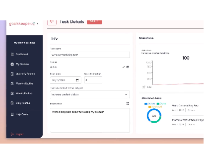 With goalskeeper.io, you can set, track and manage your small business goals. You can break down the goals into milestones, experiments, and tasks. You can focus on the crucial things with daily, weekly, monthly, and quarterly routines. You can also integrate with other online tools that you are already using. As a small business, it's critical to focus on the things that will take your business forward. Boost your productivity! Stop spending your most precious resource: your time. Manage your business goals and your tasks in one place. See your day-to-day tasks with the bigger picture every day. See your progress at any time, see your progress in any way, make sure that your work is moving the needle, and adjust your small business goals if needed. Make your small business better by learning from your achievements and failures, reflect what went wrong, and thereby avoiding making the same mistakes and doubling down on suitable actions.