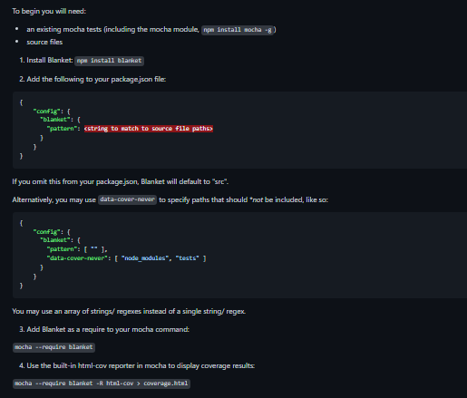 A seamless JavaScript code coverage library. Blanket.js is a code coverage tool for JavaScript that aims to be easy to install, easy to use, and easy to understand. Blanket.js can be run seamlessly or can be customized for your needs. JavaScript code coverage compliments your existing JavaScript tests by adding code coverage statistics (which lines of your source code are covered by your tests). Parsing the code using Esprima and node-falafel, and instrumenting the file by adding code tracking lines. Connecting to hooks in the test runner to output the coverage details after the tests have been completed. A Grunt plugin has been created to allow you to use Blanket like a "traditional" code coverage tool (creating instrumented copies of physical files, as opposed to live-instrumenting). Runs the QUnit-based Blanket report headlessly using PhantomJS. Results are displayed on the console, and the task will cause Grunt to fail if any of your configured coverage thresholds are not met.