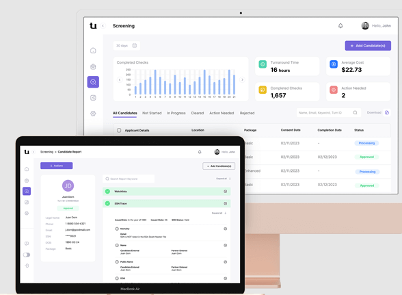 Turn has optimized the background check and verification process for a better and faster hiring experience. Tailor-made for the high-volume hiring of hourly, shift-based, or independently contracted workers. Our platform is optimized for speed, accuracy, and price, but what truly sets us apart is our customer service. Our high-touch applicant support workflow and critical internal processes ensure that every applicant can move through the background check process seamlessly. We use the social security number provided by the candidate to match their information with public records provided by sources such as credit card companies, schools, lending institutions and utility companies. Using the candidate’s SSN, we are able to obtain their previously known addresses along the dates in which they resided at each location.