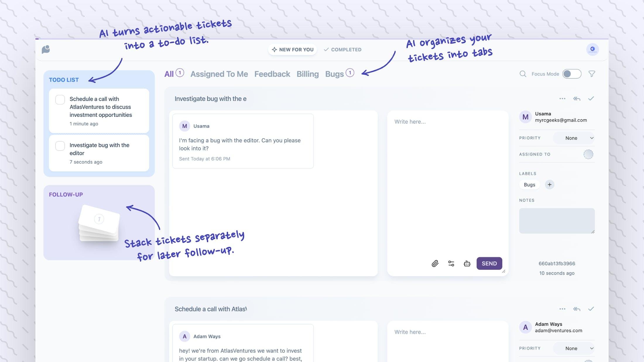 Discover the perfect intersection where AI enhances customer support. A sleek, intelligent AI-powered ticket system, designed to optimize productivity. Transform your actionable tickets into to-do lists, organize them into tabs, all wrapped up with best UX. Say goodbye to sorting through ticket to find what requires action. Userscom identifies the important tasks and turns them into to-dos. This is a productivity booster. Get clarity while responding. See customer plan, email, and custom attributes on the right side of the ticket for more personalized interactions. Embed our contact form on your website & reply to the queries from our intuitive dashboard. Easily send responses to your Userscom dashboard by using our API into your existing forms.