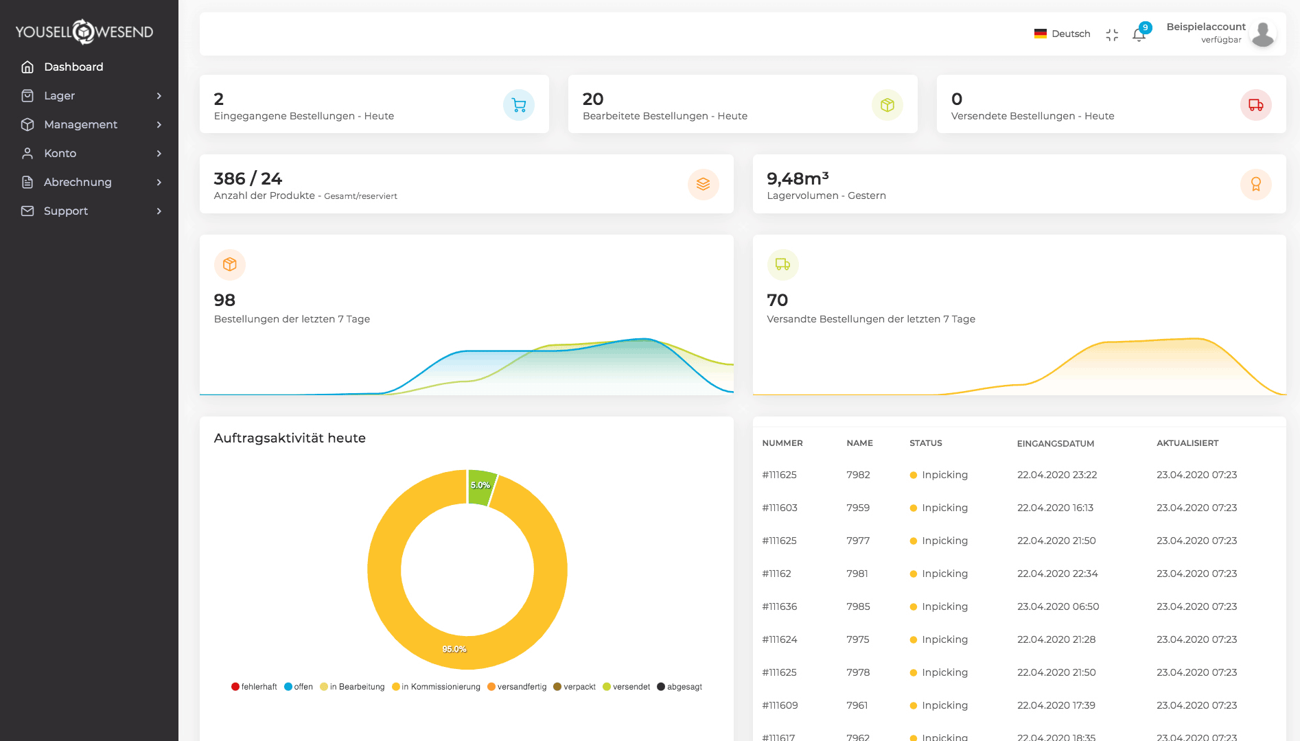 Action Dashboard. Overview of costs. Edit Orders. Generate returns label. You sell your products and your Digital Fulfillment Network does the rest. We connect online retailers to a network of warehouse locations in Germany and Europe using our digital platform. All warehouse locations use our fulfillment solution and thus guarantee 100% quality in processing. We not only ensure the technical connection of the systems, but are also your direct contact with our support team. Fast Setup. Send goods quickly! Through a digital connection via an interface to your systems and shipping service providers. Customer fulfillment portal. With the free customer fulfillment portal YouSellWeSend you have an overview of your stocks and all warehouse movements. Independent of location. Using one central software and standardized processes, your goods can be stored flexibly where it makes sense in our partner network. We fulfill articles from all industries and areas of life.