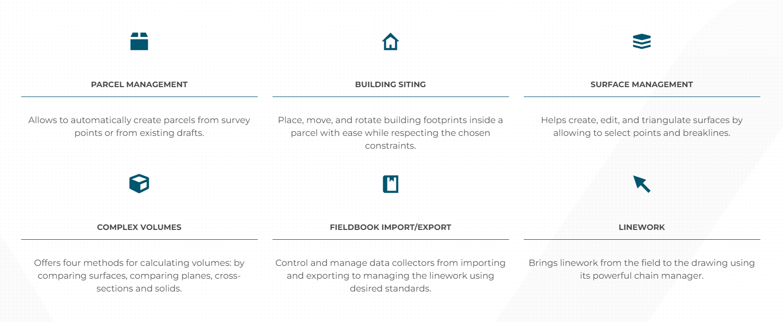 Share your data with your team directly from your CAD platform. Verify your results and add precision to your proofs. Create a faster and more precise drawing from field data. Allows to automatically create parcels from survey points or from existing drafts.Place, move, and rotate building footprints inside a parcel with ease while respecting the chosen constraints. Helps create, edit, and triangulate surfaces by allowing to select points and breaklines. Offers four methods for calculating volumes: by comparing surfaces, comparing planes, cross-sections and solids. Control and manage data collectors from importing and exporting to managing the linework using desired standards. Brings linework from the field to the drawing using its powerful chain manager.