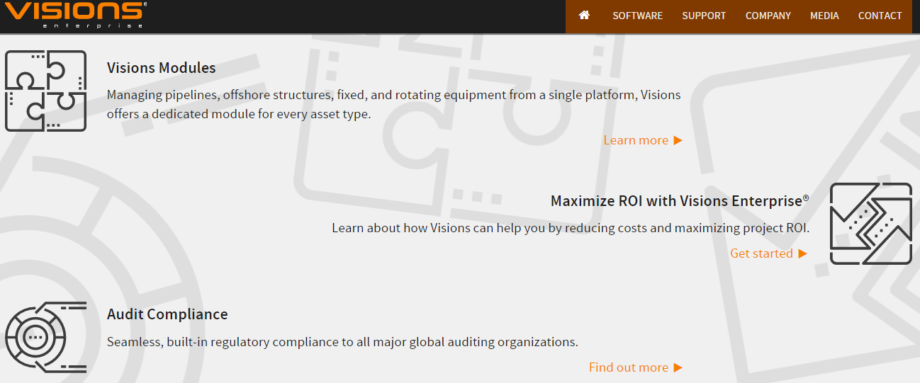 Visions is a comprehensive, integrated mechanical integrity program delivering complete solutions from the wellhead to the shipping terminal. For 25 years, it has improved asset operations, extended equipment life, reduced shutdowns, and increased profitability for companies around the globe. Managing pipelines, offshore structures, fixed, and rotating equipment from a single platform, Visions offers a dedicated module for every asset type. Seamless, built-in regulatory compliance to all major global auditing organizations. Learn about how Visions can help you by reducing costs and maximizing project ROI. Single sites and/or a low number of assets, looking for entry-level asset integrity management at a low price point. One or two plants/facilities, looking for basic, risk-based inspection data management with optional configurable modules that reflect your business requirements.