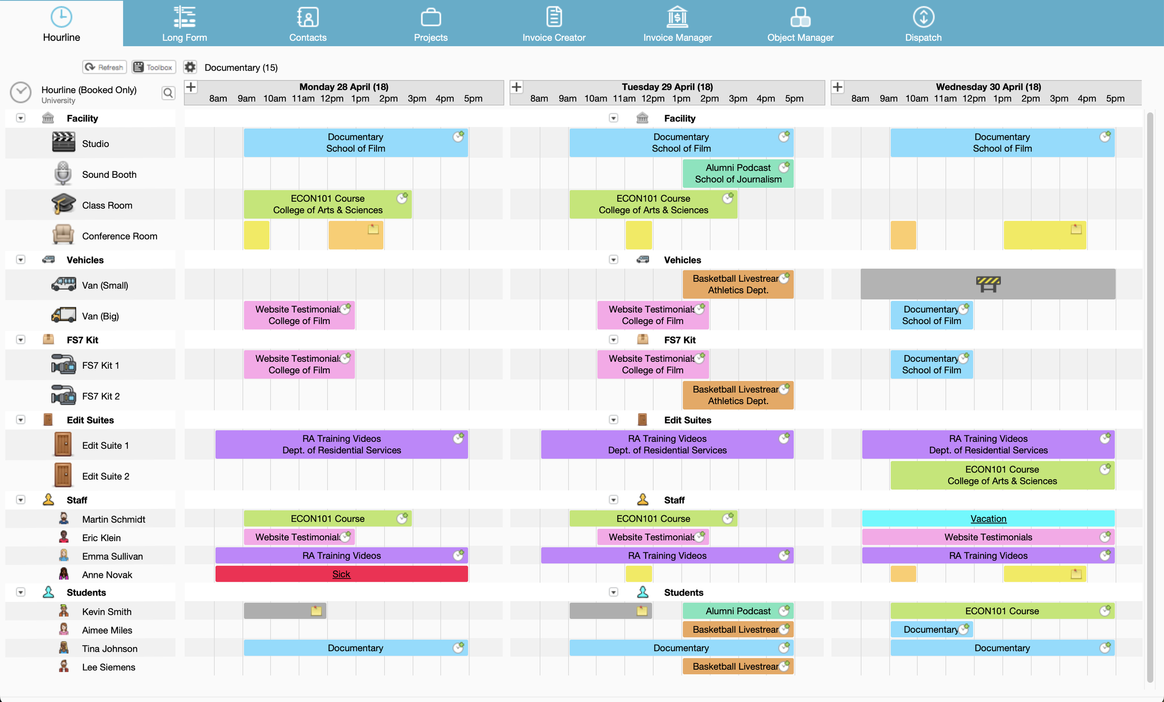 You will be able to schedule people, rooms, equipment and more in two integrated timelines.