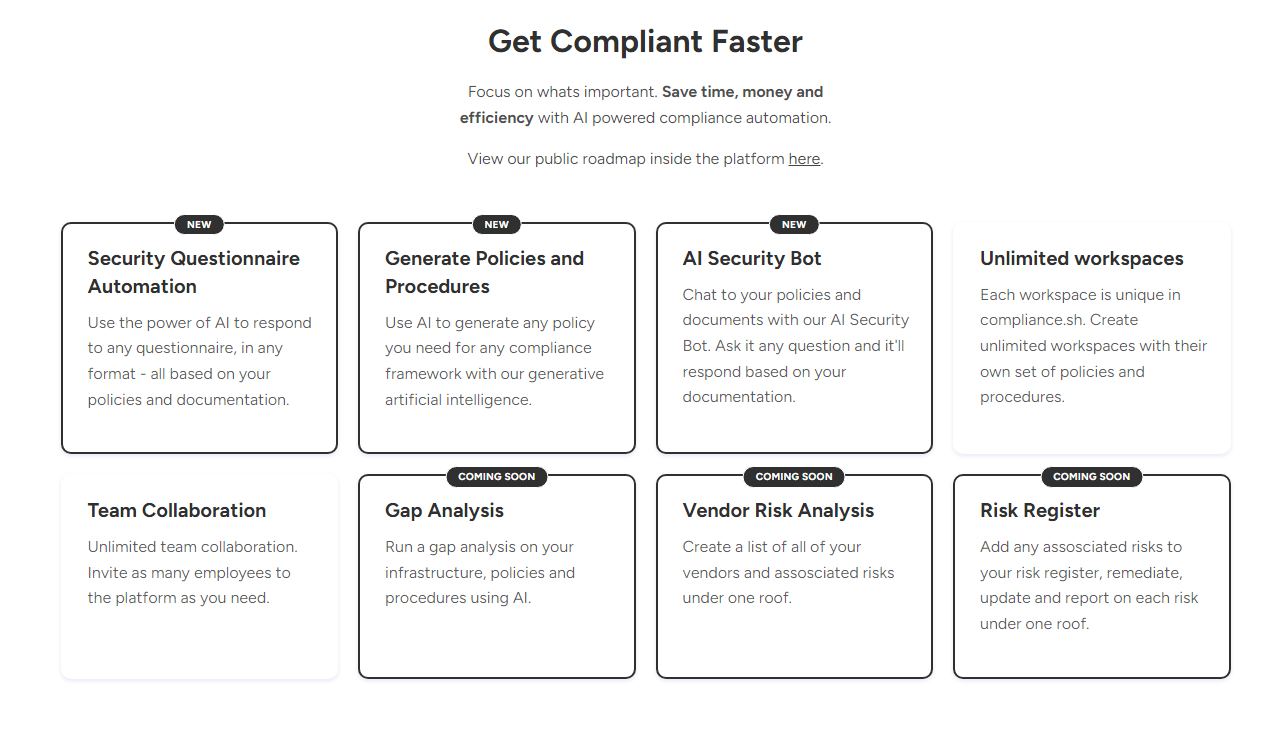 Built for startups, scale-ups and enterprises. don't let compliance slow you down. Our platform enables you to get compliant with any framework quicker than its ever been possible. Close deals faster with our AI security questionnaire automation. Our AI generates all of the answers based on your documentation and policies. Use AI to generate any policies you need for all of the common frameworks like ISO 27001, SOC 2 Type II, HIPAA, NIST and GDPR. Use the power of AI to respond to any questionnaire, in any format - all based on your policies and documentation. Use AI to generate any policy you need for any compliance framework with our generative artificial intelligence. Add any associated risks to your risk register, remediate, update and report on each risk under one roof.