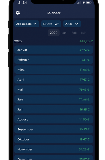 Always and everywhere, be informed about dividend income, distribution dates and custody accounts. Find out when you get which dividend via push messages. After entering the shares in your divTimer depots, the app calculates the exact amount to be expected and the date of payment, as well as a complete overview of the income of your depots for the entire year. Taxes, allowances, and purchase data are of course taken into account in the calculation. Keep the perfect overview of the month and day of distribution and the expected amount through the clearly designed dividend calendar. In the detailed view of the divTimer dividend calendar, you can find out on which day your companies will pay your dividend to you. Find your depot from the most important indices in the world. Easy creation of depots and new stocks. Even odd fractions of stocks that run via savings plans can be specified. Our divTimer support takes care of the needs of the customers every day.