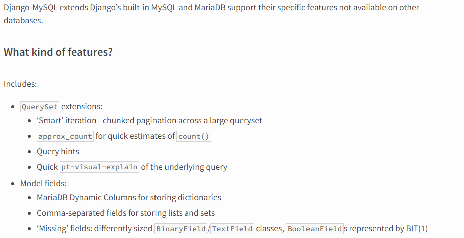 Django-MySQL extends Django’s built-in MySQL and MariaDB support their specific features not available on other databases. A new cache backend that makes use of MySQL’s upsert statement and does compression. Named locks for easy locking of e.g. external resources. Extra checks added to Django’s check framework to ensure your Django and MySQL configurations are optimal. Django-MySQL comes with a number of extensions to QuerySet that can be installed in a number of ways - e.g. adding the QuerySetMixin to your existing QuerySet subclass.