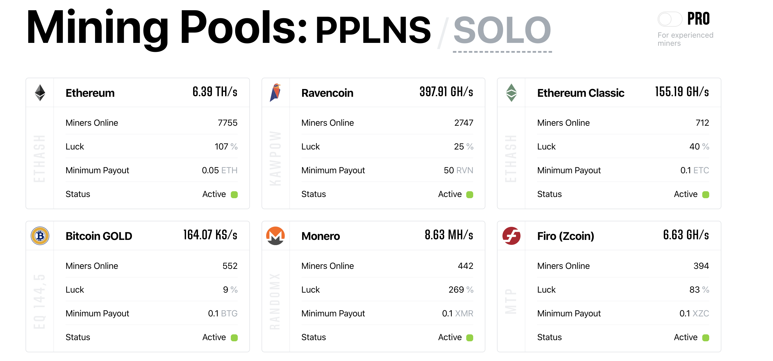 The most profitable mining pool for GPU and ASIC. Regular payments, tutorials, reliable servers, rig monitoring bot. Fully compatible with Nicehash. Real dedicated servers and DDOS protection. Dedicated port (100% compatible with Nicehash stratum). 2Miners is Nicehash officially recommended pool. Rig monitoring and new block notifications for all the pools. Free of charge for any amount of rigs. Payouts are processed automatically every 2 hours. To get the payout you need to reach the minimum amount: 0.05 for Ethereum, 0.1 coins for other Dagger Hashimoto, 0.01 coins for Equihash algorithm etc. The minimum payout value is shown on the main page of each pool.