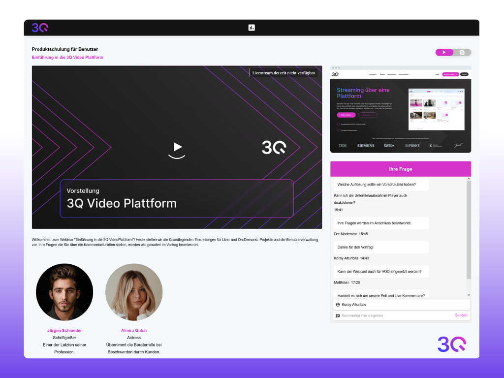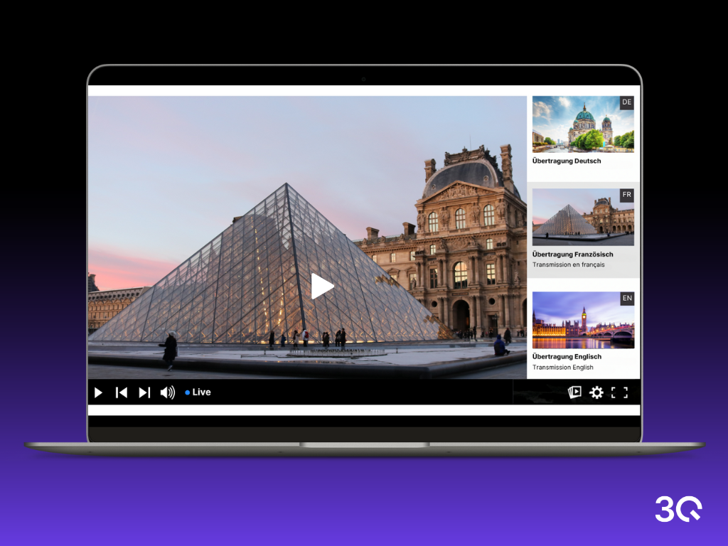 3Q's European online video platform provides access to reliable and secure video hosting and streaming technology. With its own infrastructure, global CDN, an accessible video player, intuitive video management system and smart AI solutions, AV content can be stored, managed and distributed via websites and apps. Whether live or on-demand, API-based or integrated into existing systems: 3Q brings moving images to where they are needed. GDPR-compliant and secure.