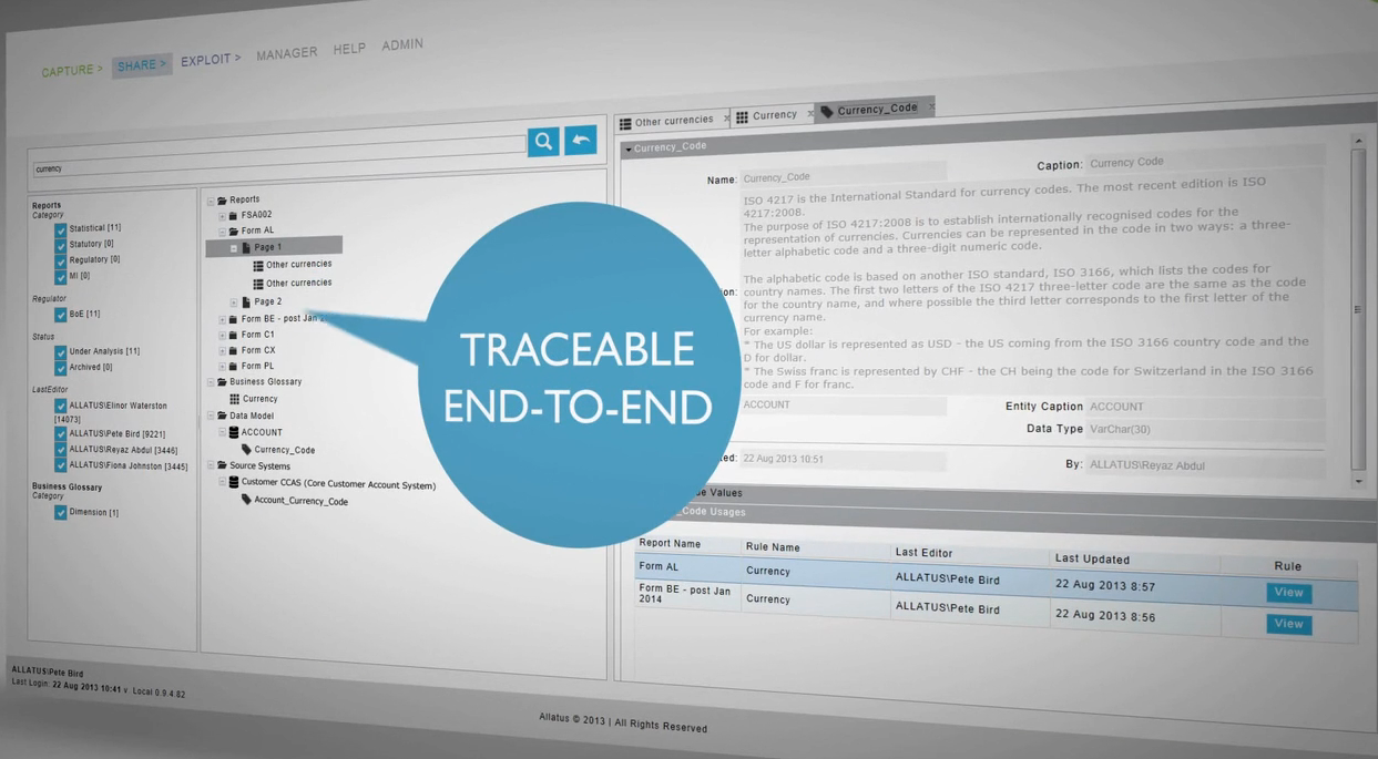 The data organisations hold is one of their biggest assets – but knowledge about that data and how it used for reporting is often held in people’s heads or unmanaged spreadsheets. Allatus Unity® is one secure, searchable framework, accessible to your team regardless of location that has the potential to realise huge productivity benefits for an organisation. Our industry recognised Regtech solution captures regulatory reporting requirements and maps them to the data governance assets, showing lineage and understanding of data and automatically producing detailed IT specifications for Reporting Solutions. Combine business and technical views of your data assets to increase collaboration, reduce regulatory reporting compliance costs, mitigate the risks associated with your data-driven initiatives.