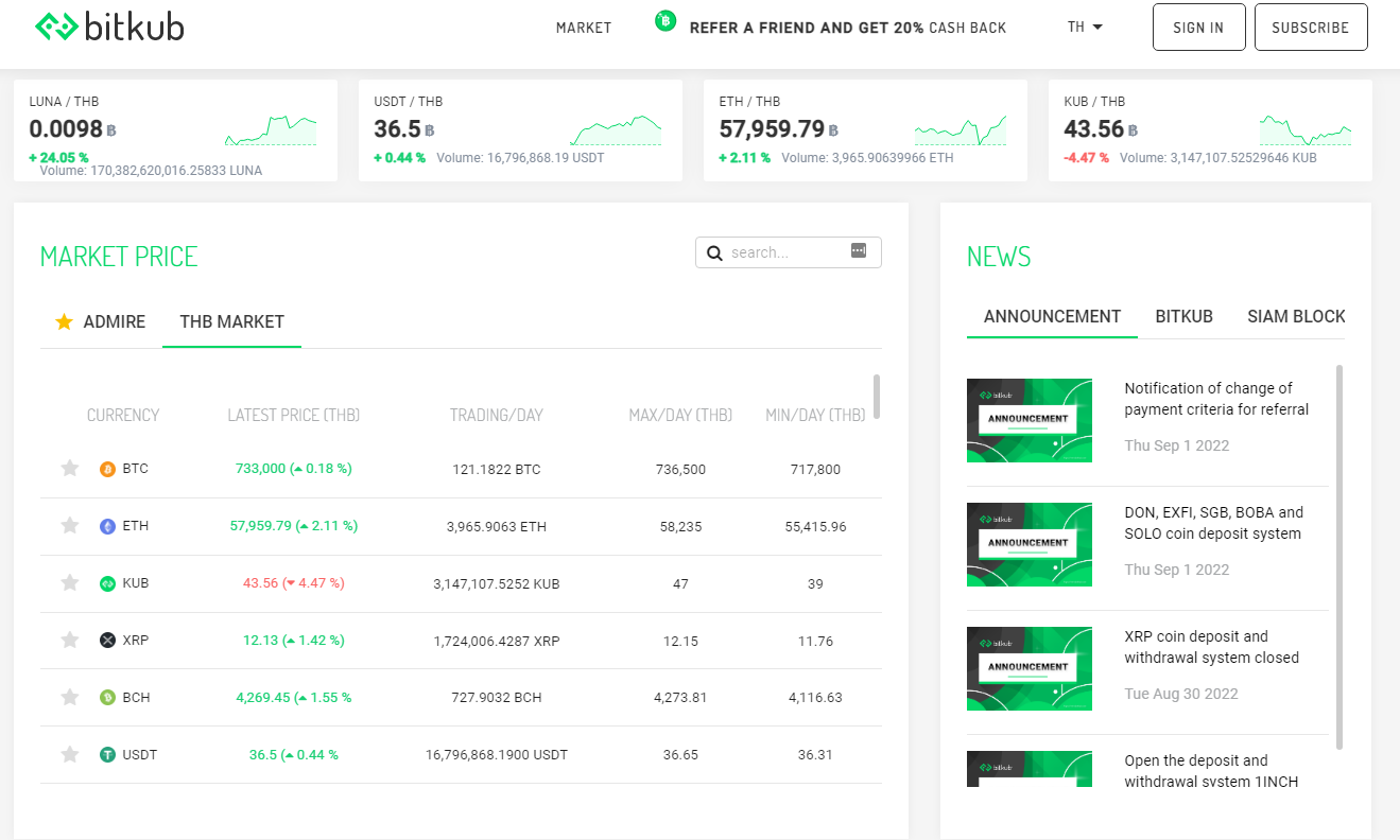 Digital coin trading website Leading in Thailand. Bitkub is a new platform for trading. And collect various coins with the baht. Deposit money or crypto coins by transferring money from a bank account. Or from a crypto wallet. Trade crypto coins on Thailand's leading platform. As no person has control over bitcoin or other crypto coins, the use of the coin gives you the right to privacy and financial transparency. You can transfer bitcoin and other crypto coins to anywhere in the world and shop online made easy. This can be done cheaper, faster and easier to use. Crypto coins are likened to digital gold today. Where you can diversify your investment both long term and short term. Correctly register business With a registered capital of 290 million baht. Sincere service and ready to help customers with all problems and questions all the time. Invite friends to trade for Get cash back up to 20%. We prevent DDoS attacks by encrypting and storing most of the coins in offline storage.