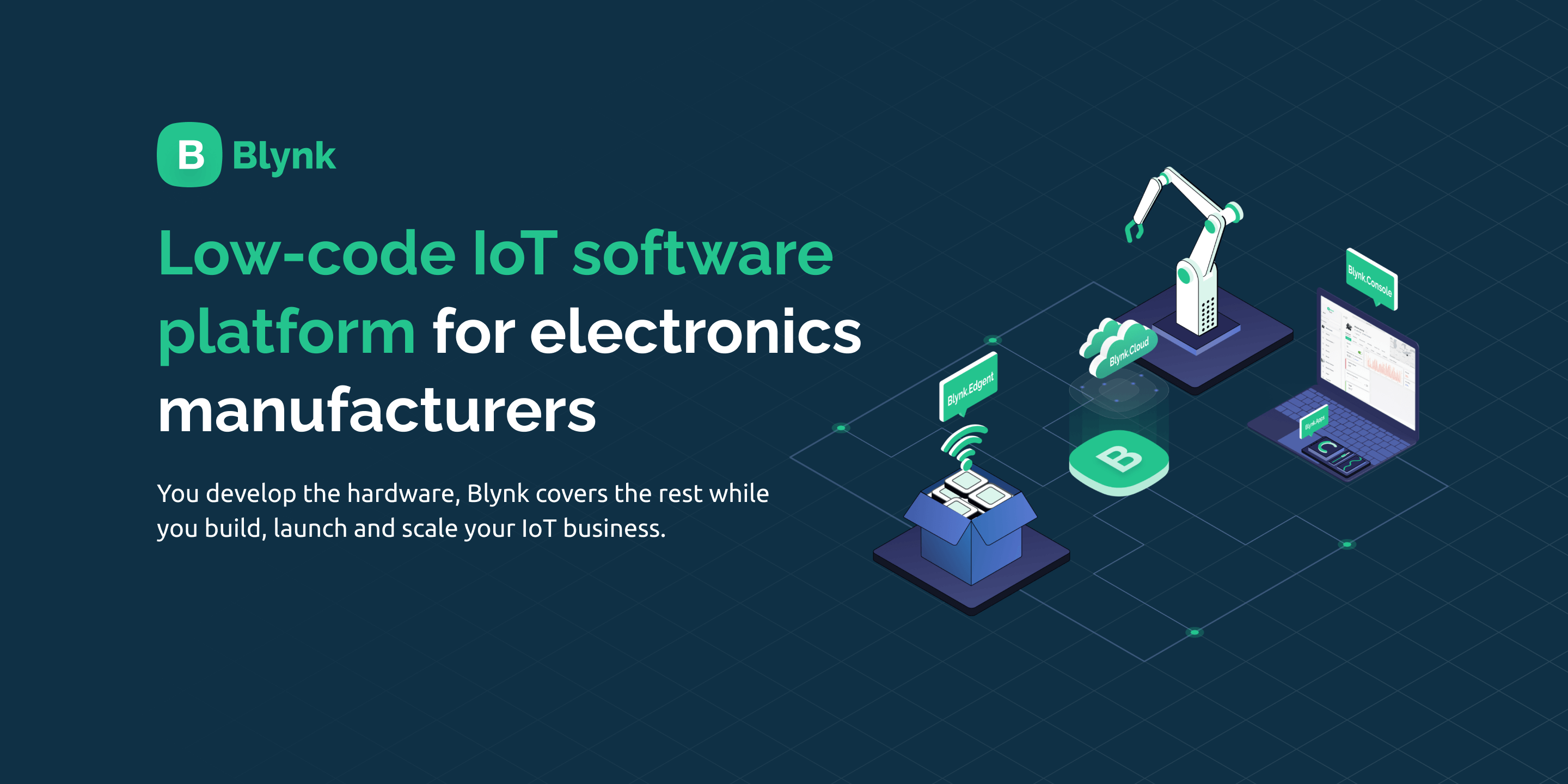 Blynk is a low-code IoT software platform for connecting devices to the cloud, building mobile apps to remotely control and monitor them, and managing thousands of users and deployed products. It’s a PaaS (Platform-as-a-Service) that helps businesses and individuals seamlessly progress from a prototype of a connected product to its commercial launch and further growth.