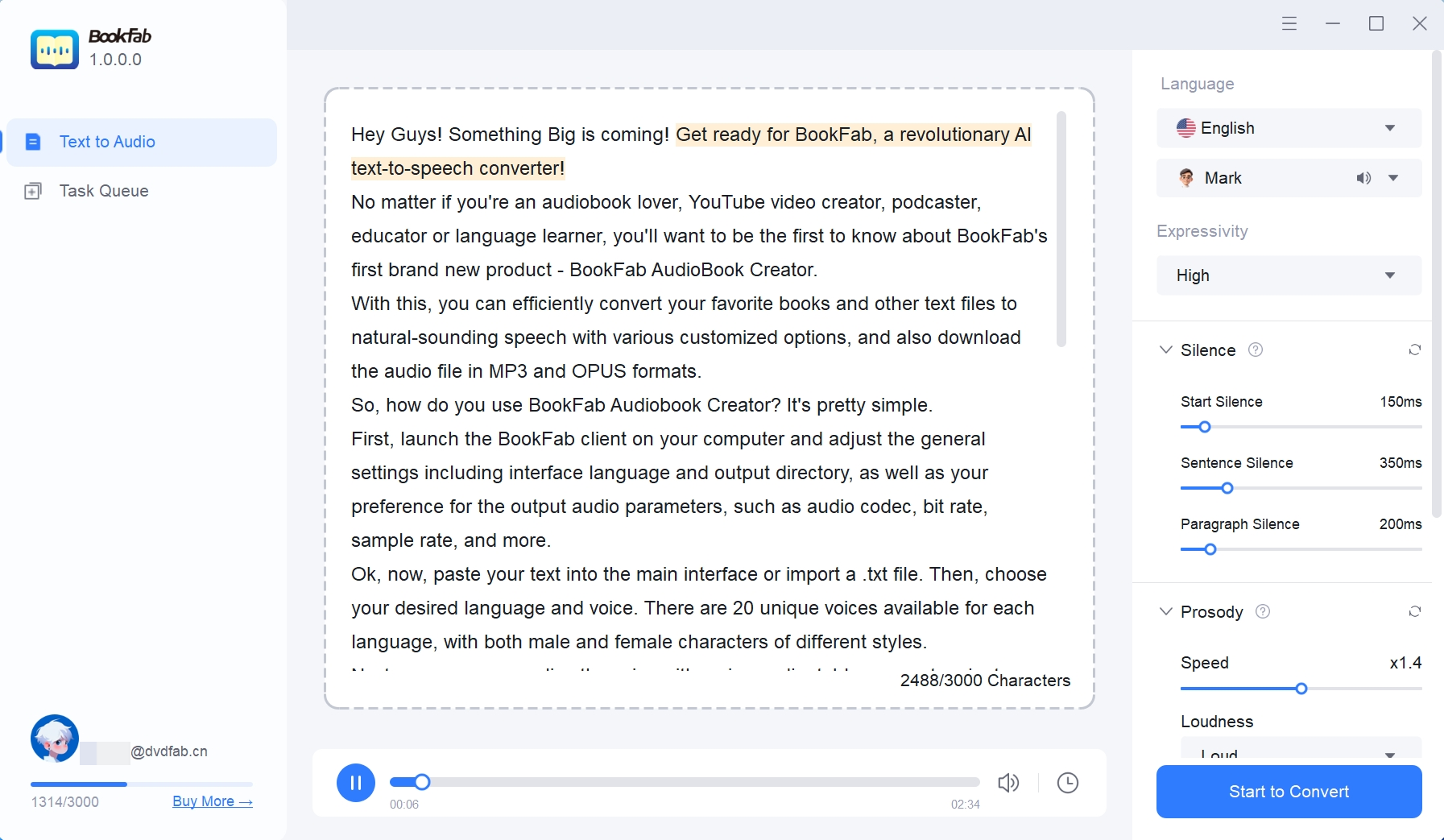 BookFab Audiobook Creator offers high-quality and personalized text-to-speech conversion. Featuring a wide range of voice and full control over parameters, this AI reader lets you create lifelike audio with ease.