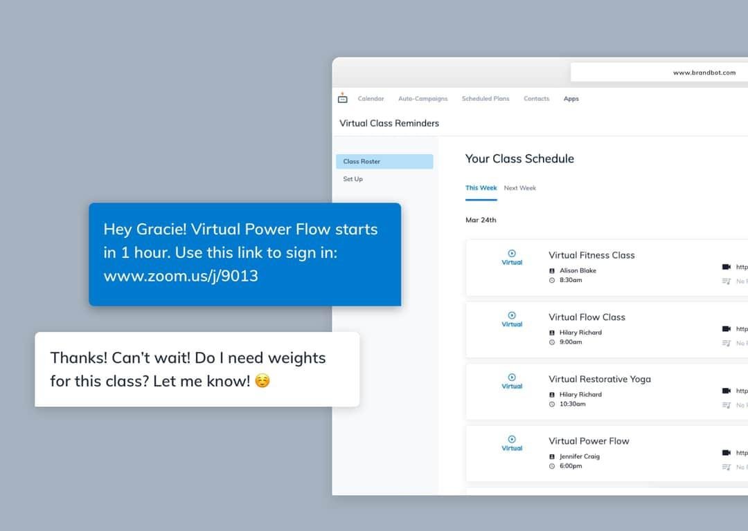 Organize all of your classes and live streaming links to power automated texts and emails to your customers when they sign up and before class. The All-In-One Customer Communication Hub. Guide, convert, retain and delight more customers by reaching out to them when it matters most. BrandBot gives you the tools to build growth through deeper relationships, making every time you reach out easier and more personal. Get the most out of MINDBODY or Pike13 from our 15+ out of the box data integrations that allow you to segment your contacts in more than 650 different ways. Now targeting the right customers has never been easier. BrandBot gives you and your team the ability to reach your customers when it matters most. We understand that sometimes that means an automated follow up series based on behavior or an event email sent next Tuesday.