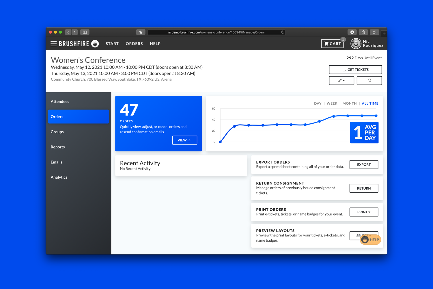 Brushfire's robust reporting dashboard allows you to manage reservations and address customer support issues, like refunds or seat changes, and see all event analytics in one place. Integrations with marketing platforms like HubSpot or Mailchimp allow you to market and sell your events seamlessly.