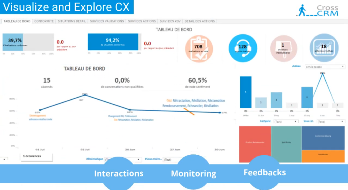 Cross CRM helps contact centers in quality management and increases the productivity of each phone call, chat, digital & social network supervision. The platform also makes it possible to considerably reduce the costs linked to quality control and CRM reporting. CROSS-CRM also allows the implementation of online training programs and AI powered speech analytics for the progress of each agent.