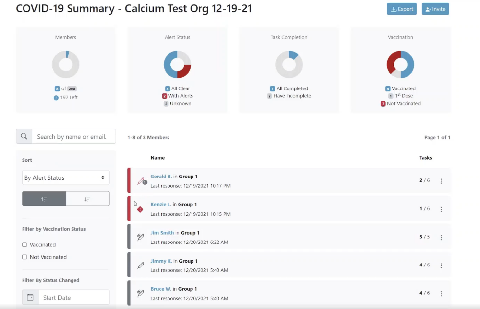 Our HIPAA-compliant COVID solution for organizations helps you protect your teams, workplaces and clients. Faster COVID vaccination tracking and pre-screenings for your employees and members. Alert employees before they leave for work to complete their daily COVID screening. Members and users can self-screen using their smartphone or PC browser. Your admin dashboard tracks vaccination status and vaccine record card uploads. It also monitors user responses and alerts you if a user is flagged. Building off our digital health app for consumers, Calcium has created a HIPAA-compliant COVID monitoring solution for employers. Secure & easy-to-use COVID screening and tracking. Eliminate the hassle of paper or cumbersome spreadsheets. Easily and securely upload vaccine record card photos. Create an account in minutes and quickly add vaccination status and vaccination card photos. The daily screening takes only seconds.