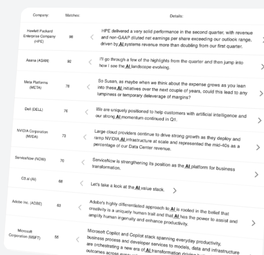 Combine the best of AI with financials, transcripts, headlines, and case studies by professionals. Effortless analysis, superior returns. See news, financials, price action, and earnings takeaways, all in one place. See key quotes from earnings debates, as well as recent related news. Track your coverage closely, while still screening broadly. Get AI feedback that searches through all public financials for disconfirming and supportive evidence. Instantly familiarize yourself with the most important debates driving the stock. Include your own ideas and get feedback from the most powerful GPT-4 class modes available today. Zero in on whatever question you have by asking the very best of financial analysts, always in your pocket. Get answers that are sourced from all public financials available to any analyst. GPT-4 class models trained with real-world investing case studies by buy-side professionals.