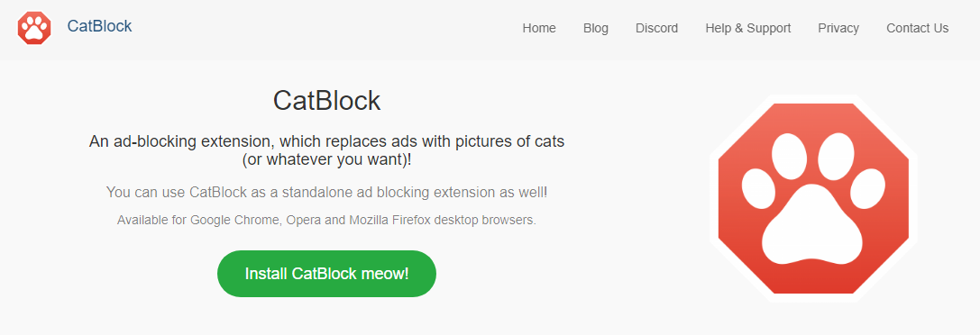 An ad-blocking extension, which replaces ads with pictures of cats. You can use CatBlock as a standalone ad-blocking extension as well! Available for Google Chrome, Opera and Mozilla Firefox desktop browsers. We've used the freely available code from AdBlock and taken all those ads you don't see, and replaced them with pictures of cats! We, the founders of this AdBlock fork, all have experience with the AdBlock project and have regularly contributed to the project in the past. Like AdBlock before us, the block is 100% open-source, licensed under the GNU GPLv3. Feel free to check out our code at GitHub. We regularly check our support site for any problems or questions you might have. We also have a public Discord server for anyone to join and get help with the block! If you'd rather not see cats, you can use any other set of images you want from Flickr!