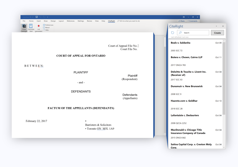 Knowledge tools for careful litigators in a hurry. Draft Faster. Move from a precedent to a finished draft by cutting out the repetitive, mindless work. Automate Citations. Produce perfectly formatted citations and books of authority with CiteRight’s Microsoft Word plugin. Recover Lost Knowledge. Get time-consuming work done so that you can focus on what really matters. Explore. Citation Tools Research and writing. Together at last. CiteRight helps you save cases from online legal databases and makes them available right where you are — inside Microsoft Word. Click on a case to cite it automatically. No Blue Book or McGill Guide required! One-button books of authorities. Done writing your factum? Generate a perfect book of authorities in seconds. Want to make a last-minute change? Click the button again. CiteRight manages your document assembly so you don’t have to. No more searching for that case you remember using that one time.