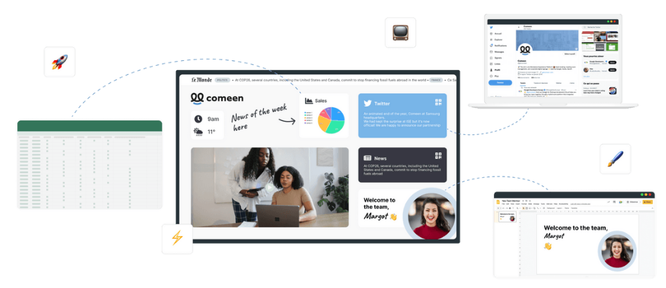 With Comeen Play, broadcast your Google Slides and PowerPoint presentations, your Docs and Word documents, and your Sheets and Excel tables on all your screens.