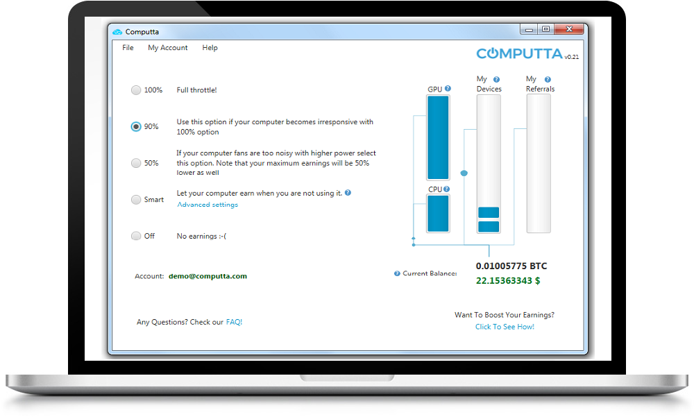 Turn your computer into a 24X7 money generator. 100% autopilot. 100% free. Everyone's Invited! Computta is a first of a kind service and application created by cryptocurrency professionals to enable anyone and everyone’s computer to make digital money for their owners on autopilot. This means that anyone with a computer can register, download our super-simple smart mining app and start generating cryptocurrency on their computers – all within 5 minutes flat. Setup is just a super-simple two-click process and will take only 5 minutes, including benchmarking time! Computta Smart Miner app is compatible with up to 95% of Windows based computers! Computta Smart Miner works in the background, invisible and 100% automated right out of the box! No tech skills needed at all! Install and Setup will only take 2 minutes and you don't have to touch any additional settings to run it.