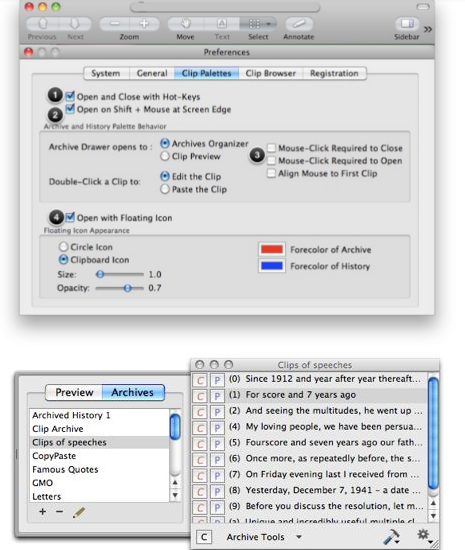 With CopyPaste start to use the most powerful feature on your computer. That feature is copy & paste which is used dozens of times every day by every computer user and with just one clipboard. CopyPaste was the first and is the most popular multiple clipboard utility for displaying, archiving, and editing multiple clipboards. See and edit any clip in your history of copies or in the more permanent clip archives. Save multiple clipboards through restarts. Incredibly useful. A great time-saver, & life saver for all Mac users. The number of clips and the hot keys to access them are no longer limited to the digits 0 to 9, but you can use all the keys on your keyboard (43) to copy to the clip archive and to paste therefrom. Concatenate all text clips into the system clipboard separated by the current date and space. Paste all text clips into the system clipboard in reverse order. The entries are separated by the current date and space.