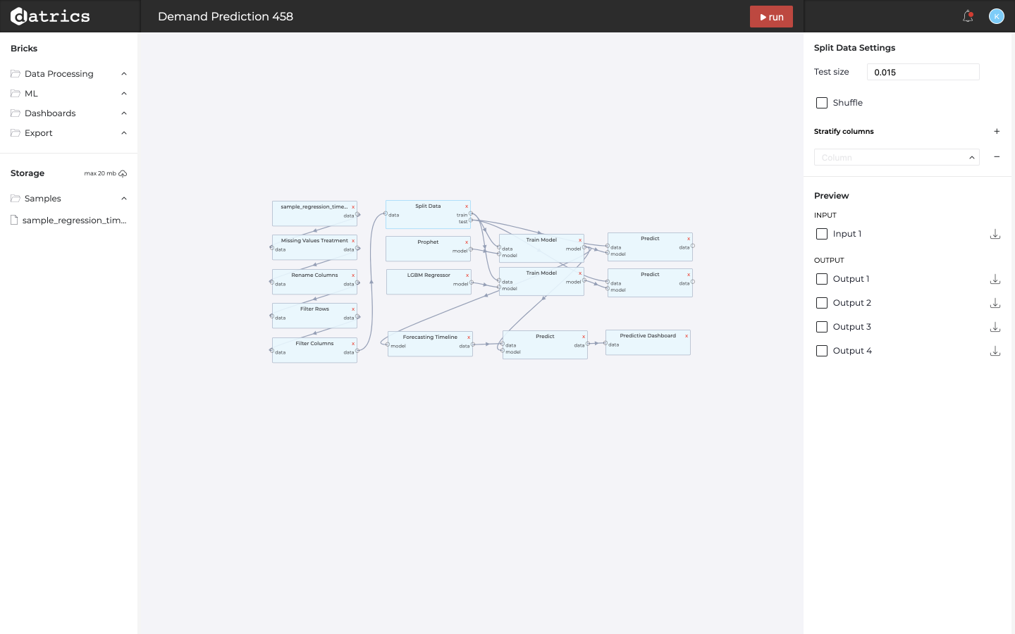 The platform enables machine learning for non-practitioners and automates MLOps for professionals within an enterprise. No prior learning needed, just upload your data to datrics.ai to do experiments, prototyping, and self-service analytics faster with template pipelines, create APIs, and forecasting dashboards in a couple of clicks.