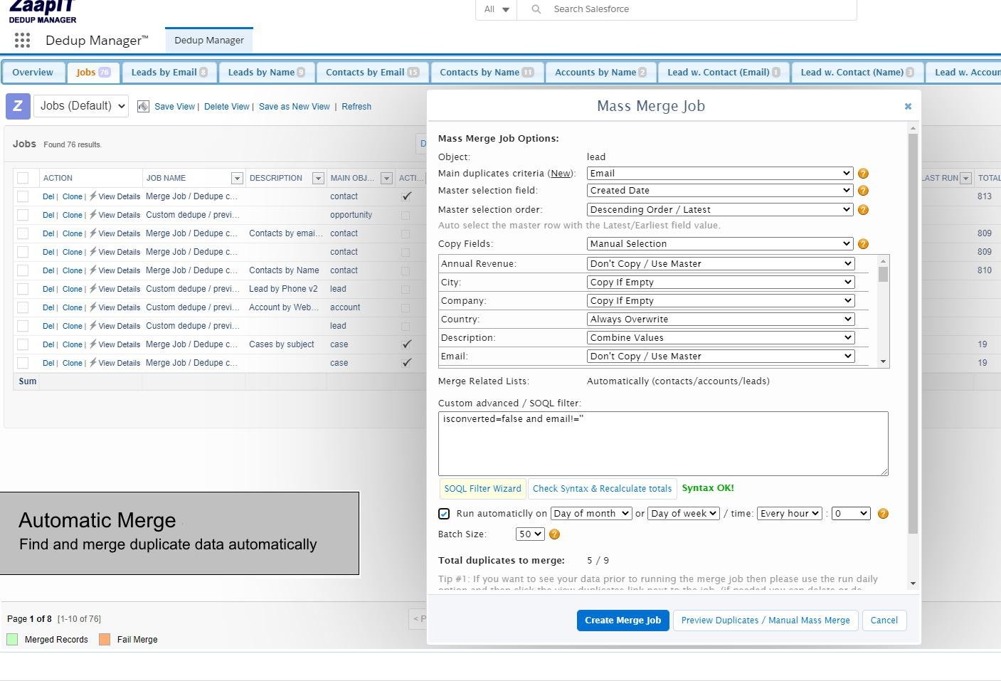 Clean your data en masse and automatically, avoid duplicate records and duplicate work. ZaapIT enables CRM admins and power-users to clean any kind of duplicated data (same-object and cross-objects) en masse and automatically. All you need to do is to setup a set of rules and let the app process the data for you.