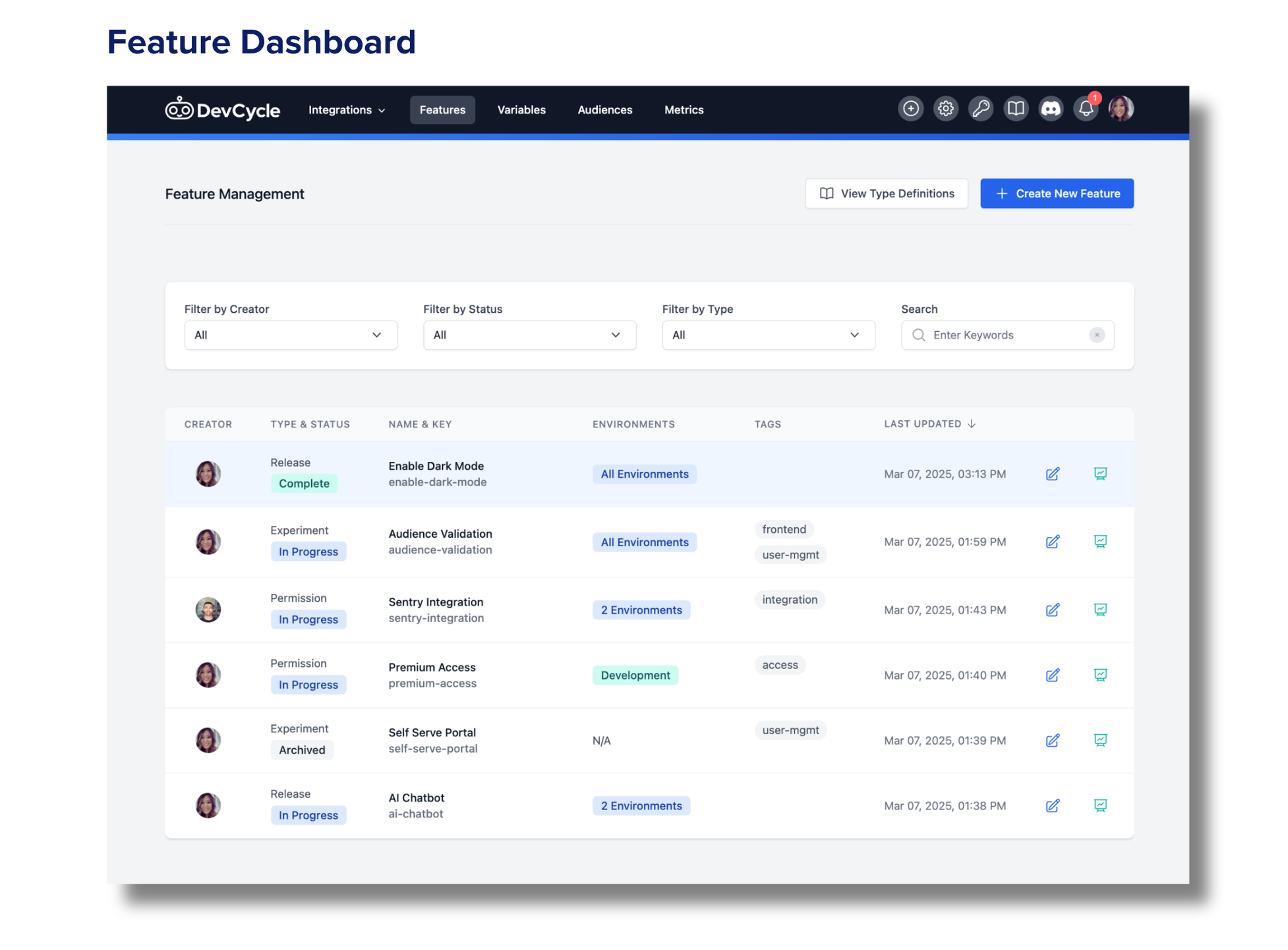Total Observability Into Your Feature Flags: Teams have complete visibility into all their features across their organization. DevCycle observability integrations help track, monitor and diagnose feature flag usage while developer integrations and tooling give full control and visibility into feature flags within code.