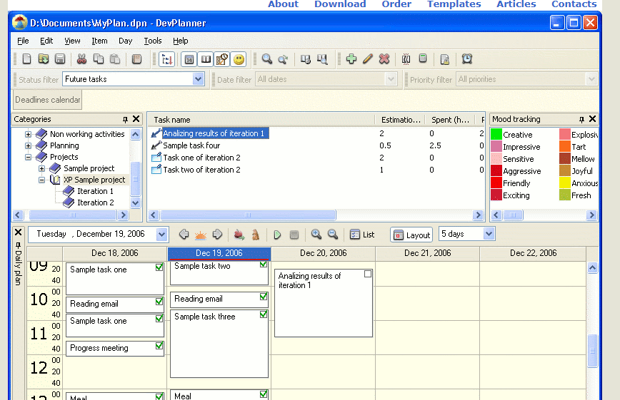 DevPlanner is a time planning and to-do list software that allows keeping track of projects, personal tasks, and other activities. The main idea of DevPlanner is based on four terms: task, estimation, daily schedule, and "self-imposed" deadline. These four things are really important for managing tasks and gathering time feedback, as result improving individual productivity and estimating skills. DevPlanner carefully stores tasks grouped in categories, stages, projects or any other units required. These tasks are sources for planning and time tracking. Each task can be estimated, deadlined, prioritized, and scheduled once or more for today or a later date. No need to remember tasks, DevPlanner will do it for You. Just fill your daily time using already defined tasks or define other tasks at any time you need. The new release of DevPlanner includes the exciting possibility to track emotional state by selecting the appropriate color.