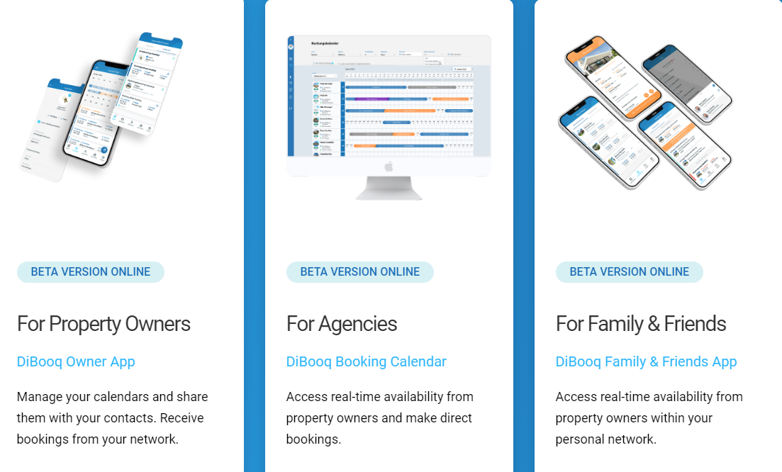 DiBooq connects all market participants in one network, delivering real time data through automated processes and streamlined communication-mechanisms. Our direct booking property management software (PMS) enables you to create your personal vacation rental network. It provides a real time booking calendar that can be shared with agencies, friends, family members and regular guests. All target groups can book directly into the owner’s calendar from now on the device of their choice. DiBooq comes along with three products: Host App (iOS/Android), Agency App (Desktop), Family & Friends App (iOS/Android). It also offers an iCalendar export, payment interfaces (Stripe online payment), push notifications, an audit-proof booking history and 100% direct booking in real time!