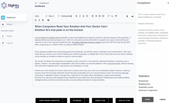 Digintu Tell is a writing assistant that helps you create vibrant text and audio content with suggestions from AI. Digintu Tell is an intelligent writing assistant that helps copywriters, bloggers, researchers, influencers, marketers, or entrepreneurs to craft engaging stories in a shorter time with a flair for originality. A creative AI partner who can instantly transform your speech from microphone or audio files into original text, pictures, and breathtaking AI artwork. You’ll finally have the ideal story to convey your message. While saving you hours trying to find the right words, our AI assistant rephrases your sentences and finds analogies. It suggests and auto-completes what to write next, helping you to write faster and better. With a few clicks, our AI co-writer produces highly accurate, easily readable summaries and estimates the reading time and sentiment of your text. Your AI writing assistant reviews spelling, punctuation, grammar, clarity, and engagement.