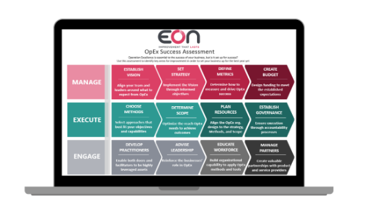 EON is specifically designed to help leaders and teams be more productive, generate impact and sustain the gains. Define and deploy a well-articulated business strategy that is understood and supported across the organization.Custom designed solutions, fit-for-purpose technology and tools that build workforce alignment, create enterprise transparency, and drive collaboration. Fully developed implementation models to identify opportunities and close the gap. Plus, a library of collateral to leverage along your journey so you don't have to recreate the wheel. Cloud-based software created to help align operations excellence to the business, implement the improvements, develop the capabilities, and measure your performance. Improvement professionals to guide you down the path and serve as a force multiplier for your team.