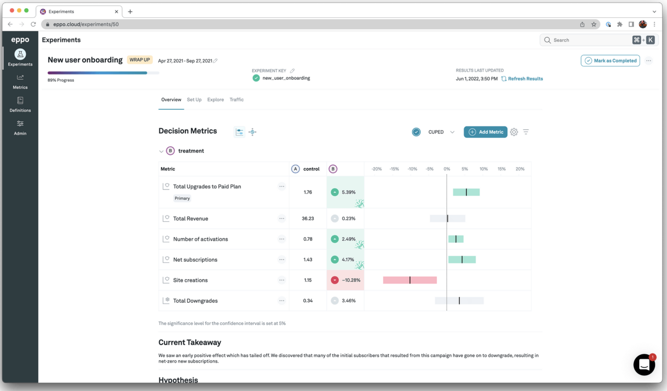 Eppo helps companies run useful, reliable experiments by automating analysis, diagnostics, and investigations, all on top of your data warehouse. See each experiment's impacted metrics, status, confidence intervals, and other metadata in a central place that your whole team can track. You can look at traffic splits, double check the set up, add a hypothesis, and so much more. In Eppo, you configure experiment data via SQL snippets, reinforcing a single source of truth for metrics. We do all data computations in your warehouse, so no raw events ever leave your system. Like metrics and dimensions, experiment assignments in Eppo are as simple as SQL snippets pulling from your data warehouse. Whether you're using LaunchDarkly or a home grown tool, as long as it's in your warehouse, Eppo can use it. Eppo generates clean, easy to read reports that team members without degrees in statistics can understand and use.