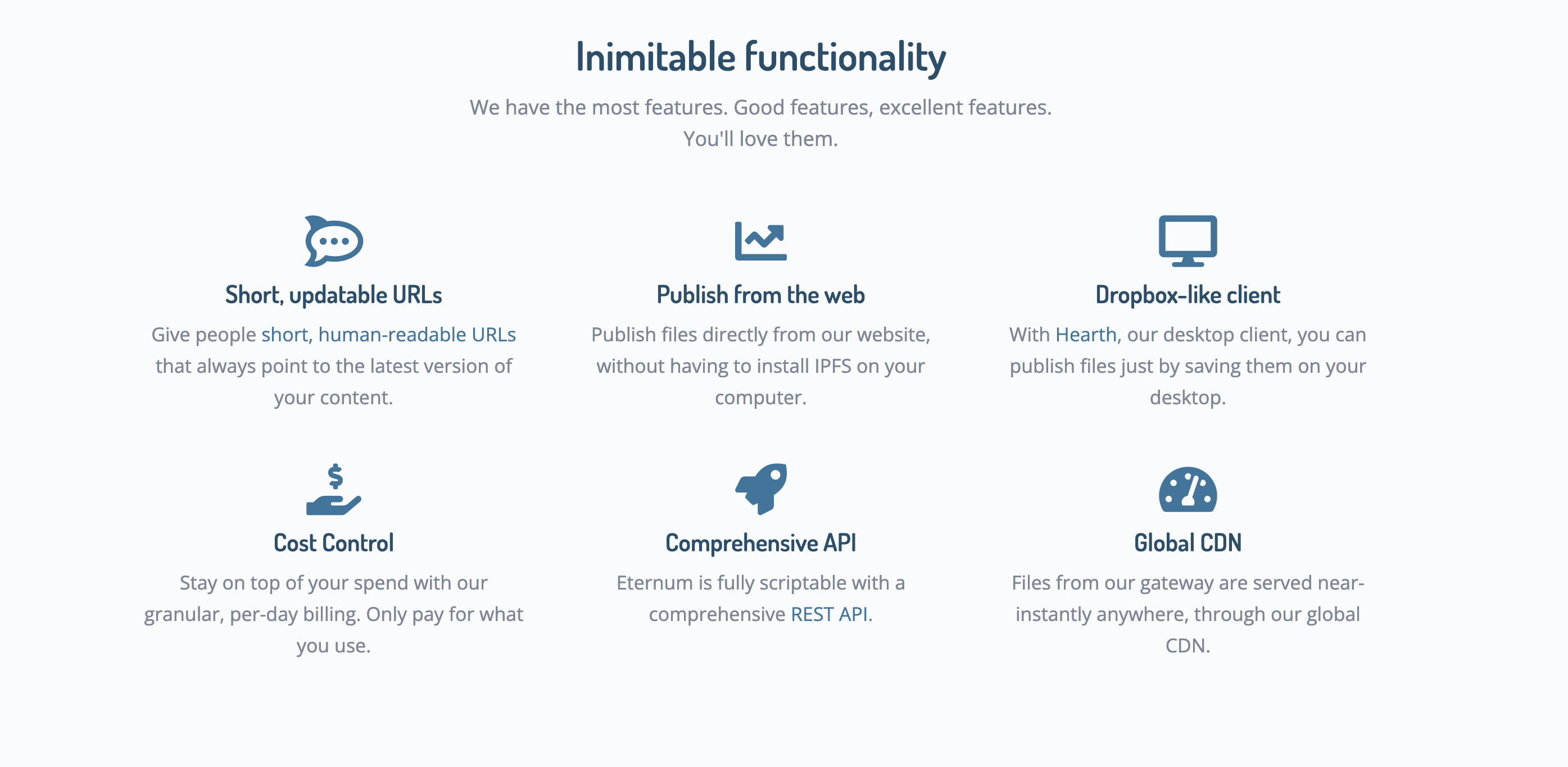 Eternum is a simple and easy-to-use IPFS pinning service. It will host your IPFS files so you can be sure they'll always be available, and it comes with an API that you can use in your applications. Give people short, human-readable URLs that always point to the latest version of your content. Publish files directly from our website, without having to install IPFS on your computer. With Hearth, our desktop client, you can publish files just by saving them on your desktop. Stay on top of your spend with our granular, per-day billing. Only pay for what you use. Files from our gateway are served near-instantly anywhere, through our global CDN.