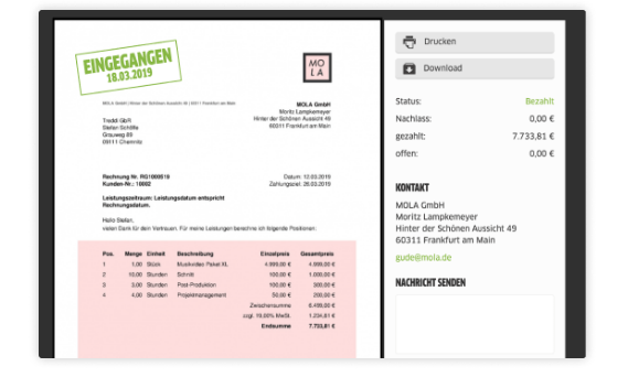 Create your own professional and legally compliant invoice in just a few minutes and send it directly by post or email. Your customers can access all invoices online and pay them directly. We support you throughout the entire process: designing documents, creating and sending invoices and then making sure that they are paid. Thanks to many useful helpers, you can do your bookkeeping yourself without stress and send everything to your tax advisor with just one click. Just let FastBill take care of your paperwork: Receipts are automatically collected, digitized, and categorized. Including account reconciliation and financial reports with FastBill Premium you can save a lot of time. Keep track of your income and expenses. Thanks to banking, you always know how much money you currently have available. With the customer files you keep an eye on payment behavior and contacts.