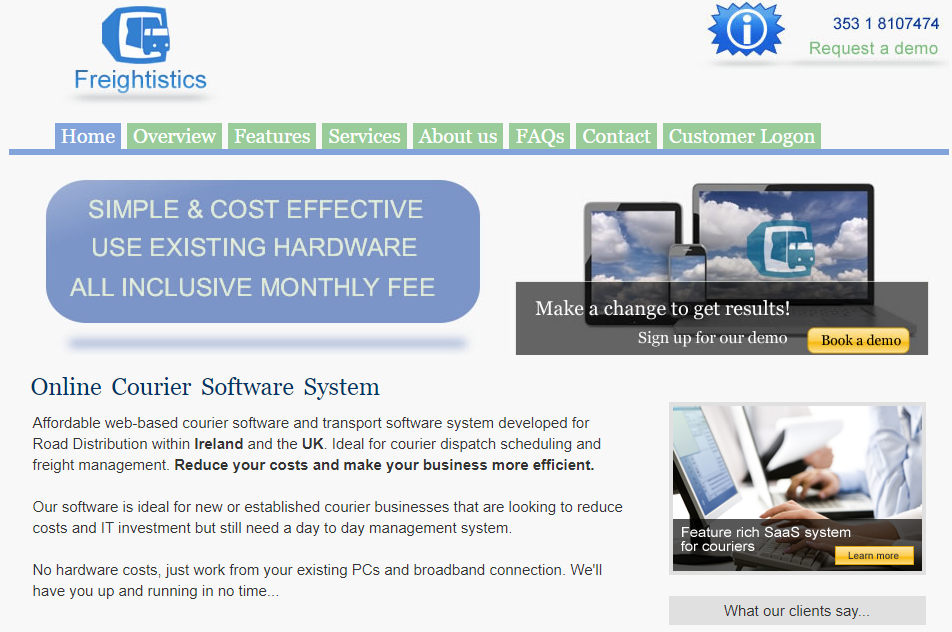 Affordable web-based courier software and transport software system developed for Road Distribution within Ireland and the UK. Ideal for courier dispatch scheduling and freight management. Reduce your costs and make your business more efficient. Our software is ideal for new or established courier businesses that are looking to reduce costs and IT investment but still need a day-to-day management system. No hardware costs, just work from your existing PCs and broadband connection. We'll have you up and running in no time. Check the features below to identify which product suits your needs. Whether its Freightistics (full system), ConsignBook (online bookings) or Translabel (on-site implant end-of-day system). Freightistics is an online courier system for cost-effective management of courier & transport businesses. From point of order entry to invoicing your customer, with all that is managed between. See below for the list of key features of our Pro version.