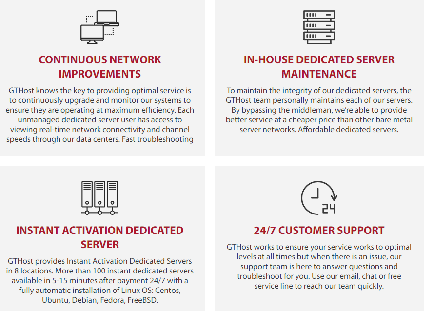 GTHost ensure complete transparency with all pricing. Your final cost is itemized and complete before your first payment is due. Access your account billing through our easy customer dashboard to see each charge, make changes and get pricing questions answered quickly. Our systems employ leading brand dedicated servers with state-of-the-art components including Samsung, Seagate and Micron storage and Intel CPU. With better components we can guarantee better service across all dedicated servers. We know your time is important and downtime for your company, employees and customers can be a major drain on your resources. This is why GTHost is committed to providing continuous, 100% network uptime guarantee. With optimal equipment and a knowledgeable team, we make sure you’re never stuck waiting on our dedicated servers. GTHost is committed to bringing clients across the USA, Canada and Europe better, more reliable dedicated servers rental.