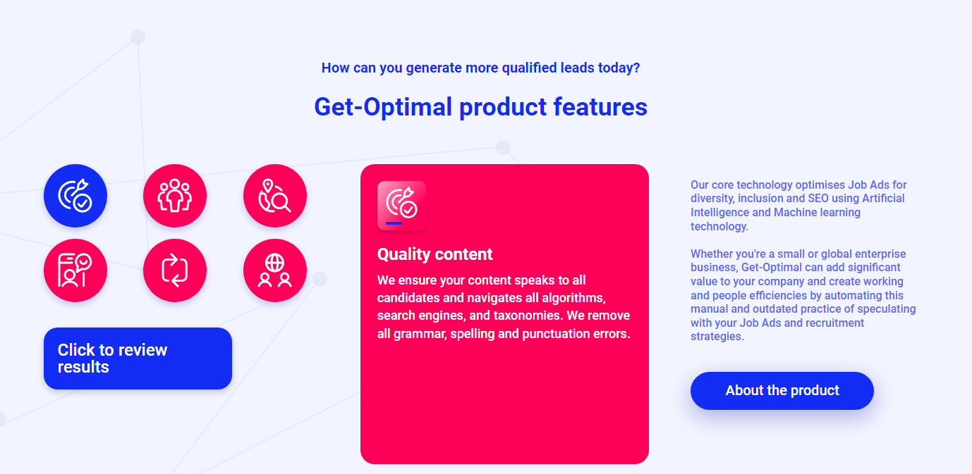 Optimal provide an on-demand Job Ad optimization service where you can receive up to a 30% increase in the Job Ads performance, leading to a rise in inclusive applications, increased quality of candidates, placements and commissions. Optimal has grown by 433% since December 2019. The highly optimized Job Ads also include gender decoding (we built a cool gender decoding tool). It analyses and removes subtle gender-coded language and unconscious bias from all of your Job Ads. 98% of customers Job Ads we analyze are masculine coded (only appeal to male candidates). That’s not good enough is it? Optimal enables inclusivity for your business. Save time, increase efficiency and boost people effectiveness by automating the part of your job you least enjoy, your Job Ads. By applying our industry-first formula to your Job Ads, your budgets work harder for you, reducing wastage and addressing the lack of quality candidates coming into your pipeline.