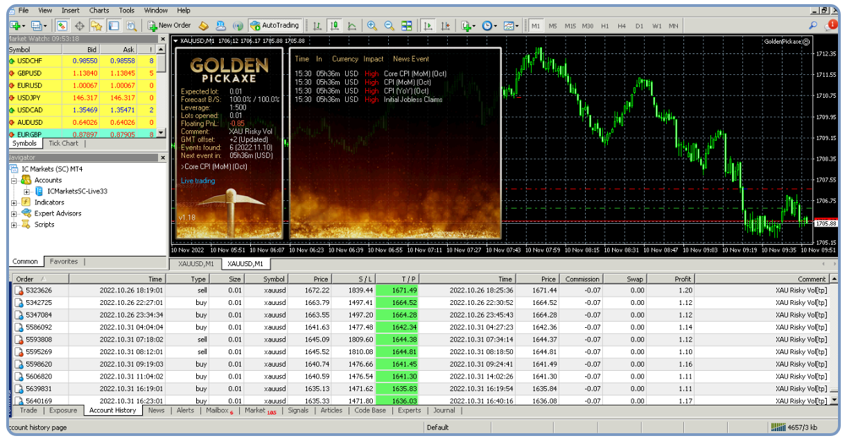 Golden Pickaxe is a mean-reversion grid trading Forex robot that uses machine learning technology to place high-profit potential trades on the Gold market.