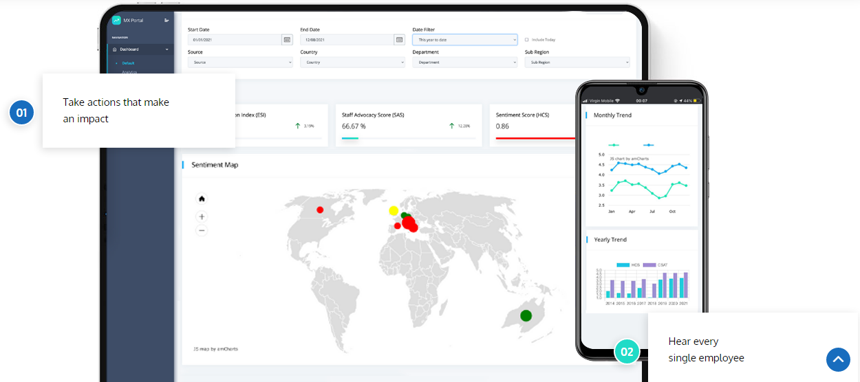 EmployeeMX enables organizations to collect feedback and every interaction that happens along the employee life cycle, the experiences that involve an employee's role, workspace, manager, and wellbeing. With EMX, listen and improve experiences for every employee. EmployeeMX enables organizations to monitor, respond, and improve the main points along the employee journey. Connect with your employees 24/7 and capture real-time feedback in the moments that matter. Whether in the office, on job sites, or remote, hear every voice in your organization with a listening engine that makes sure you can take action when and where it matters most. EmployeeMX uncovers experiences that drive employees to join, contribute, and ultimately become brand advocates for their organizations. EmployeeMX can help uncover insights to boost engagement. Create a culture of feedback and recognition. Reduce employee turnover rate.
