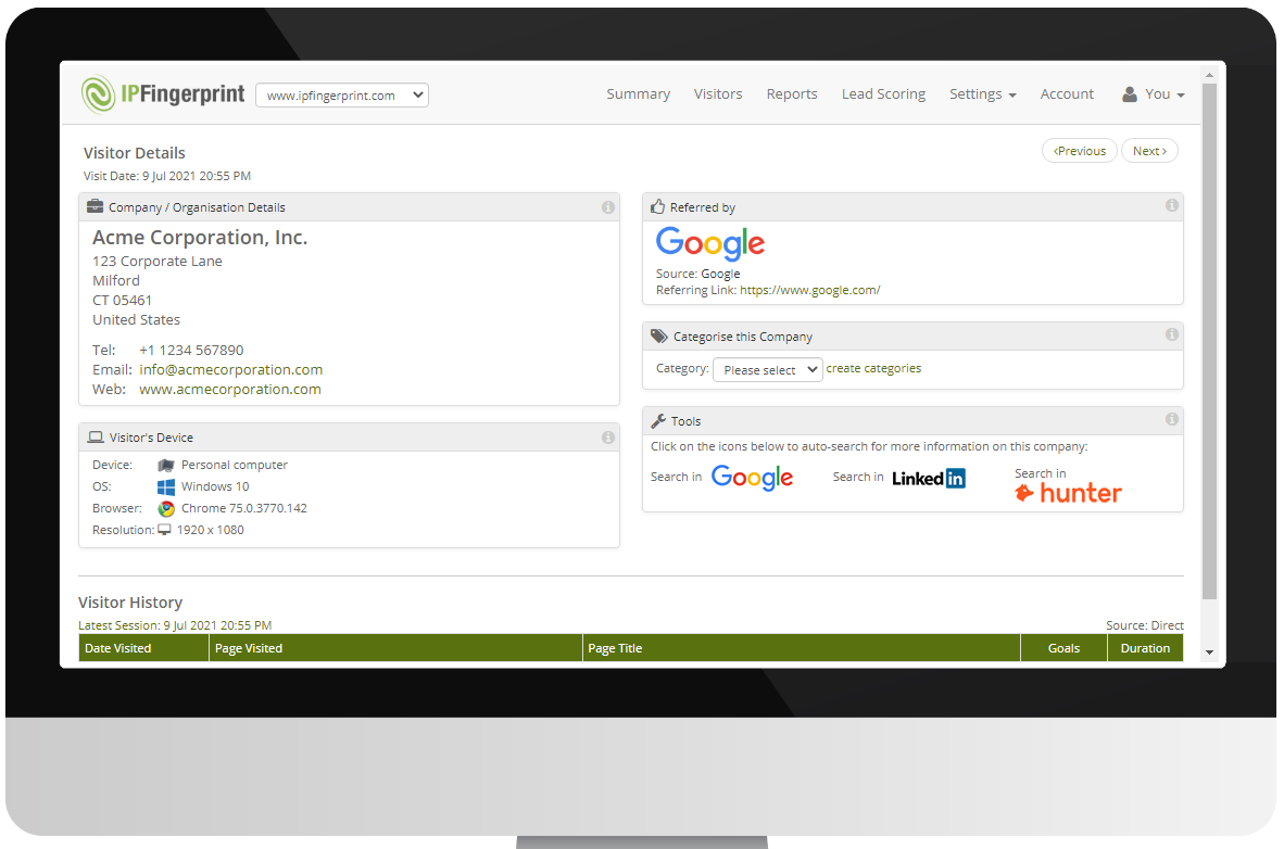 IPFingerprint will identify businesses that are looking at your website and show you the pages, services or products that they are viewing. It will also tell you how these visitors found your website and, if via Google Ads: which phrases they used to get there. More business leads to your funnel without increasing your marketing budget! Lead generation – by identifying businesses silently flowing through your website that wouldn’t otherwise be on the radar. Empower and motivate sales teams – by enriching new business pipeline with higher-potential leads taken straight from your traffic. Use Lead Score filters – to deliver the right lead data to the right individual and teams with geographical remits. Get a grip on Google Ads spend – by leveraging search-phrase tracking to identify your cash-cow phrases while eliminating excess spend on disused phrases.