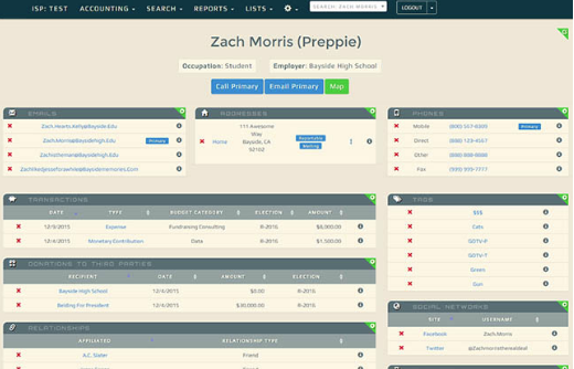 The most advanced political accounting, CRM, compliance reporting & fundraising toolkit. ISP is a compliance professional's dream that's easy for first time users. Our exclusive artificial intelligence does your busy work (like requesting and updating occupation and employer information from contributors). You focus on what's important. Intuitive tools and smart design to make the money side of your campaign light years better. Note: ISP is not credit card processing/voter targeting software.