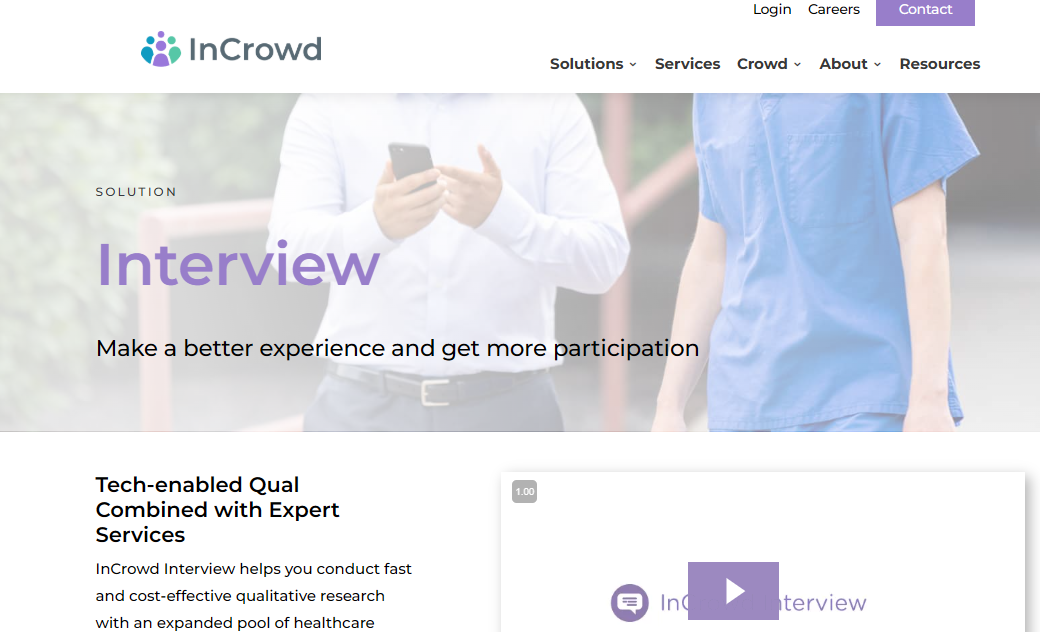 InCrowd Interview is a tech-enabled qualitative research solution designed to conduct fast and cost-effective qualitative research with an expanded pool of healthcare professionals. Same-day scheduling means projects that once took several weeks, or even longer, can be completed in a few days. The process involves finding verified participants in the panel, scheduling interviews with experts, conducting and recording interviews, and storing recordings and transcripts on the platform. The solution offers expanded access by creating a strong user experience that addresses barriers to participation for healthcare professionals, making it easy for both researchers and HCPs to engage in qualitative research. Streamlined technology facilitates the workflow by automating identification, invitations, and participant and moderator scheduling through one simple execution. Designed with compliance in mind, it improves communications while providing in-platform storage for transcripts.