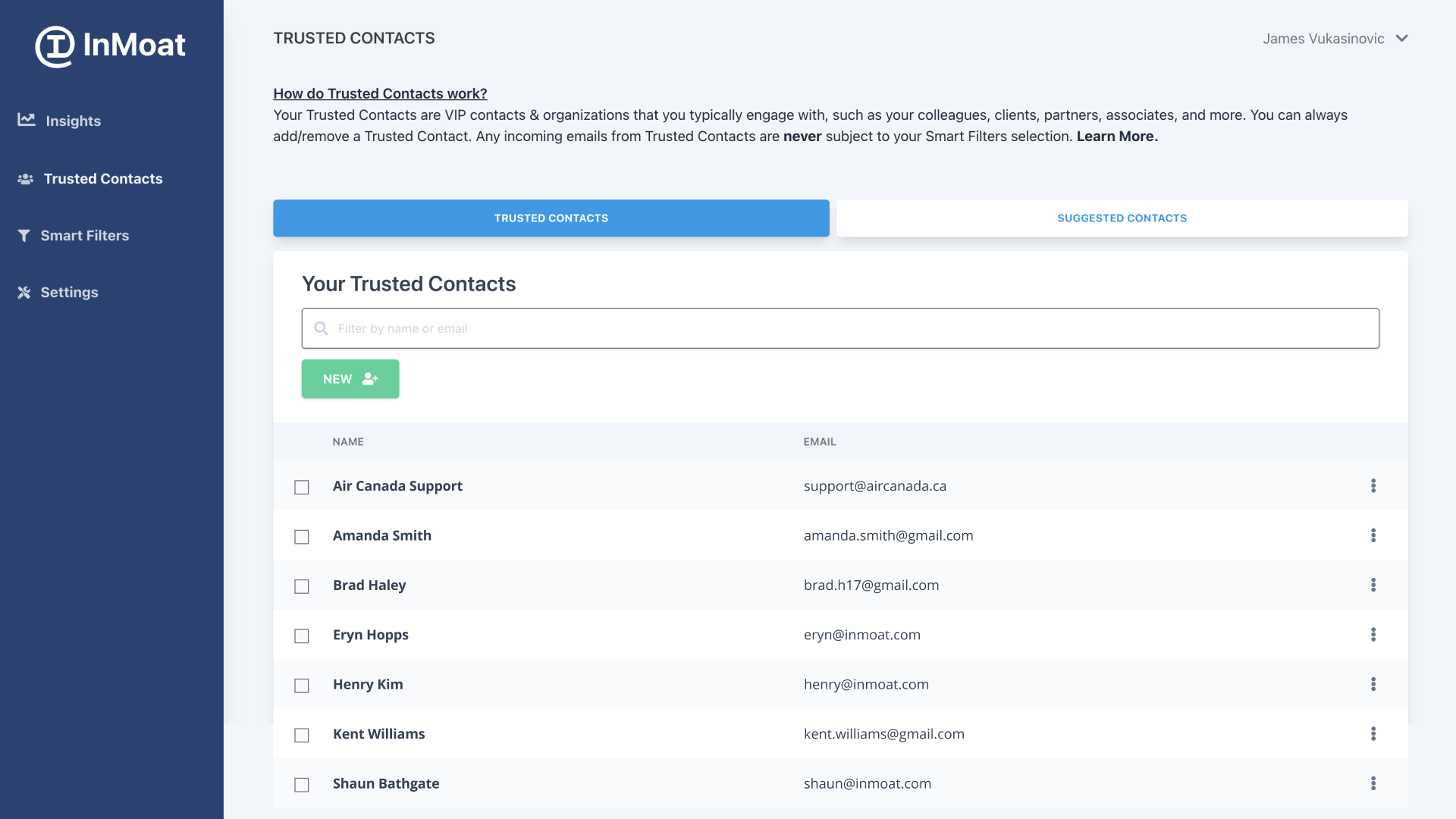 Keep your inbox up-to-date by managing your email priorities from your InMoat dashboard. Review your suggested contacts to add to your Trusted list, update your Trusted Contacts, and update your Smart Filters.