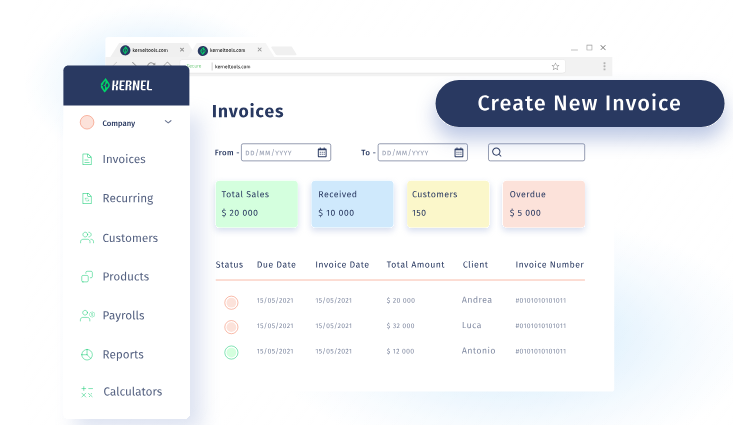 We offer many invoice templates to choose from. To send an invoice, all you need to do is add the name and email of your recipient, and you can easily download or send the invoice directly.